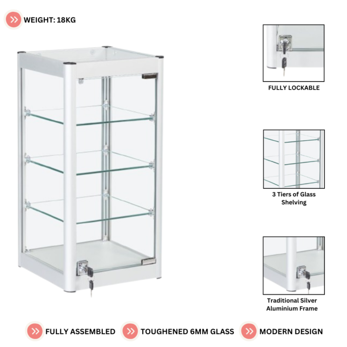 £128.28Original price was: £128.28.£119.89Current price is: £119.89. ( £143.87 Incl. VAT )Silver Glass Countertop Display Cabinet – Lockable, 3 Shelves