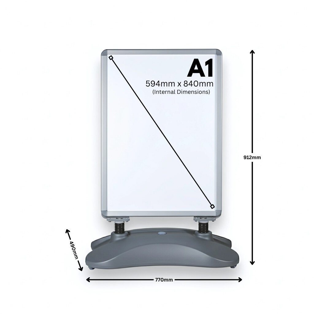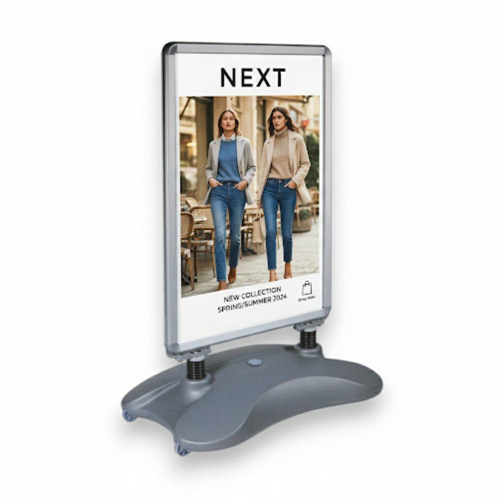 Featuring a sleek silver aluminium snap frame, this sign adds a professional finish that complements any environment, from busy high streets to retail parks. The double-sided display maximises visibility, allowing your posters to catch attention from both directions, increasing footfall and customer engagement.