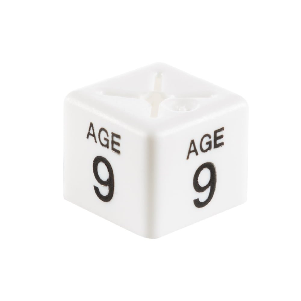 These Age 9 White Sizecubes are easy to use. Simply slide them over any type of metal hook hanger to indicate clothing sizes clearly on your hanging display. These Sizecubes are made with thicker plastic for rugged durability, making these Sizecubes a cost-effective purchase for your business as they will last long-term and can be reused over and over again.