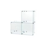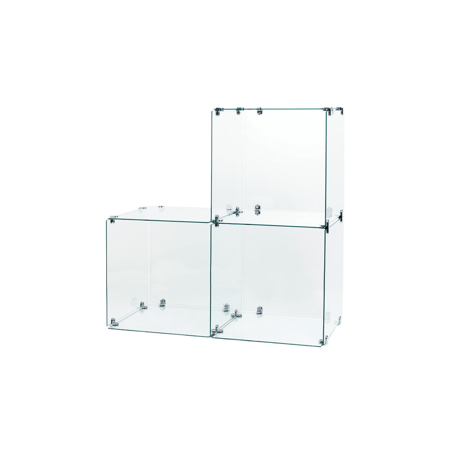 3 Stepped Cubes Retail Display With these 2 Glass Cubes Shop Display Kit you receive all the necessary 2-way, 3-way or 4-way chrome glass clips and connectors. These toughened Glass Cubes are also stackable, allowing you to make interesting shapes that will capture your customer’s attention.