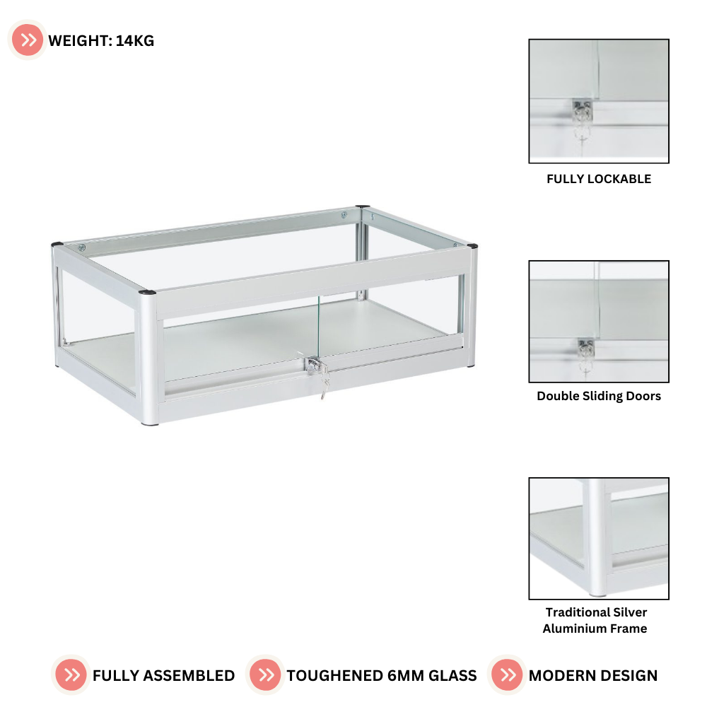 Lockable Silver Aluminium Glass Countertop Display Case | Secure Showcase with Sliding Doors for Retail and Exhibitions