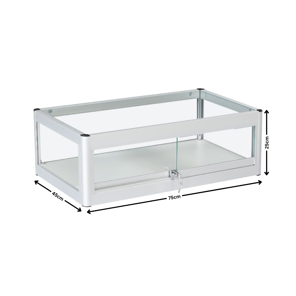 With compact dimensions (Height: 250mm, Width: 750mm, Depth: 450mm) and a lightweight construction (14kg), this display case fits perfectly on countertops while offering ample space for your products. The modern silver finish complements any environment, from retail stores and trade shows to home collections.