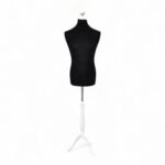 Professional male tailor’s bust with UK Size 40 proportions, White wood tripod stand, and adjustable height. Lightweight yet durable, ideal for tailoring, garment fitting, and retail display.