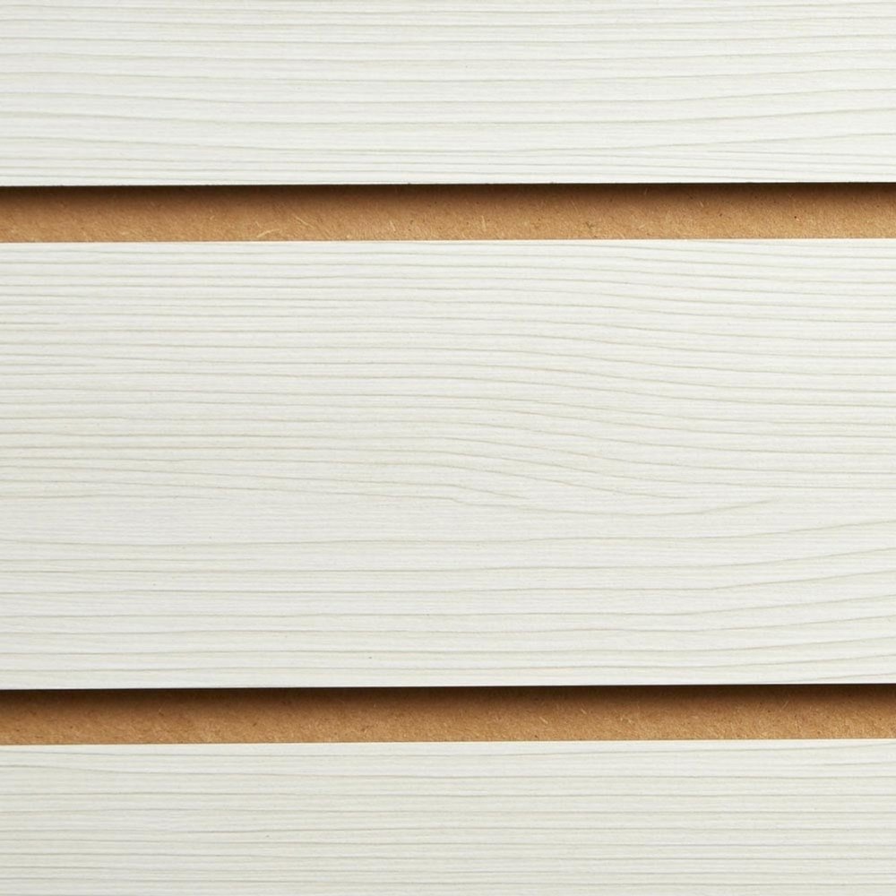 - Pino white slatwall board panels with a textured woodgrain melamine finish