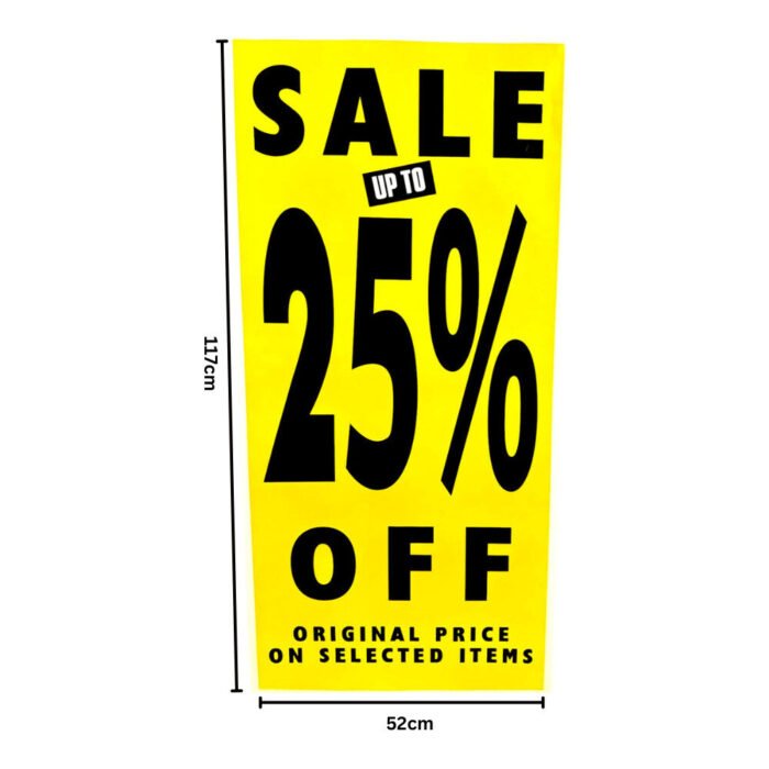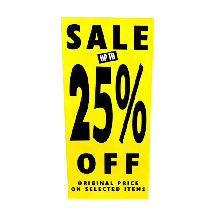 Boost your retail sales with our eye-catching “SALE Up to 25% OFF Original Prices on Selected Items” poster. Featuring a striking yellow background with bold black text, this display sign is designed to grab attention instantly and entice customers into your store. Ideal for shop windows, walls, or entrances, this high-quality sign effectively communicates your limited-time discounts, helping to maximize customer engagement and drive sales. Perfect for use in retail stores, supermarkets, and pop-up shops, this poster is a must-have for any business looking to promote special offers and seasonal sales.