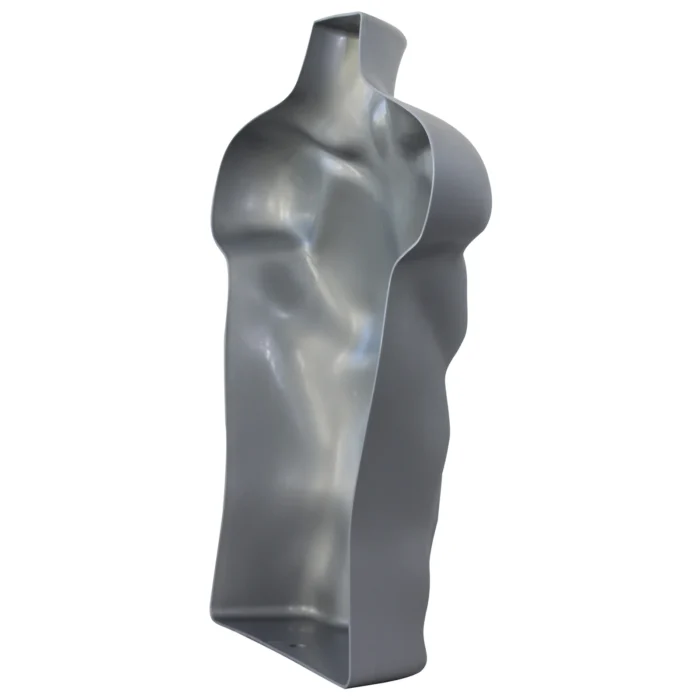 Showcase menswear with contemporary style using the 3/4 Silver Male Hanging Torso Form. Designed for boutiques, showrooms, and retail spaces with a minimalist aesthetic, this sleek mannequin is a durable and space-efficient solution for apparel display.