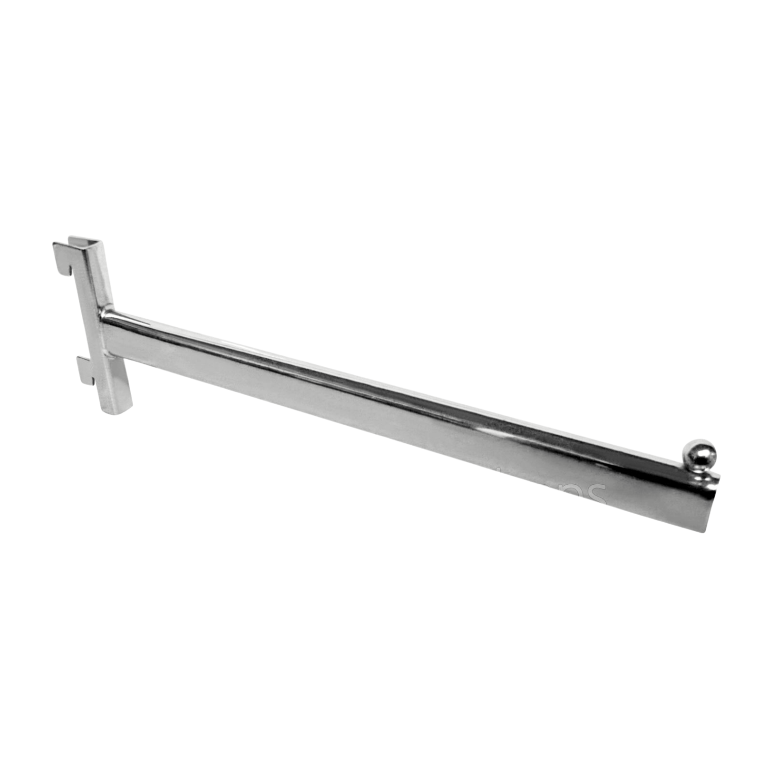 The Twin Slot Straight Arm is a sturdy and reliable display accessory, crafted from chrome-finished oval tubing for a sleek and professional look. Measuring 300mm in length, it features a fixed ball stop at the end to securely hold hangers and prevent garments from slipping off.